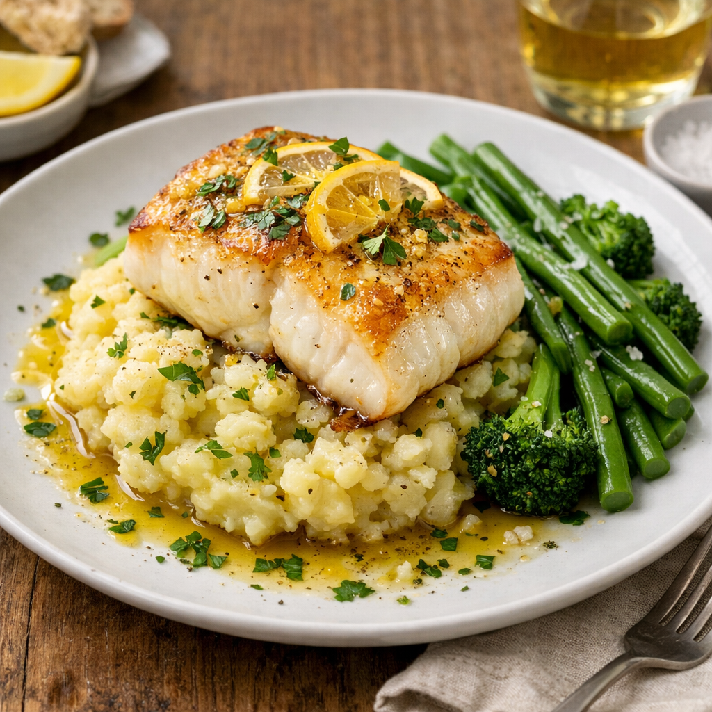 Dos de cabillaud rôti, écrasé de pommes de terre à l’huile d’olive & légumes verts